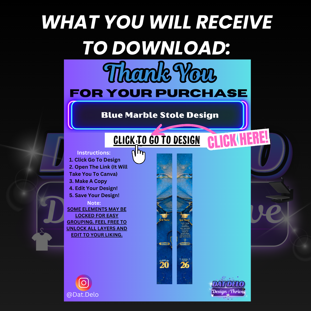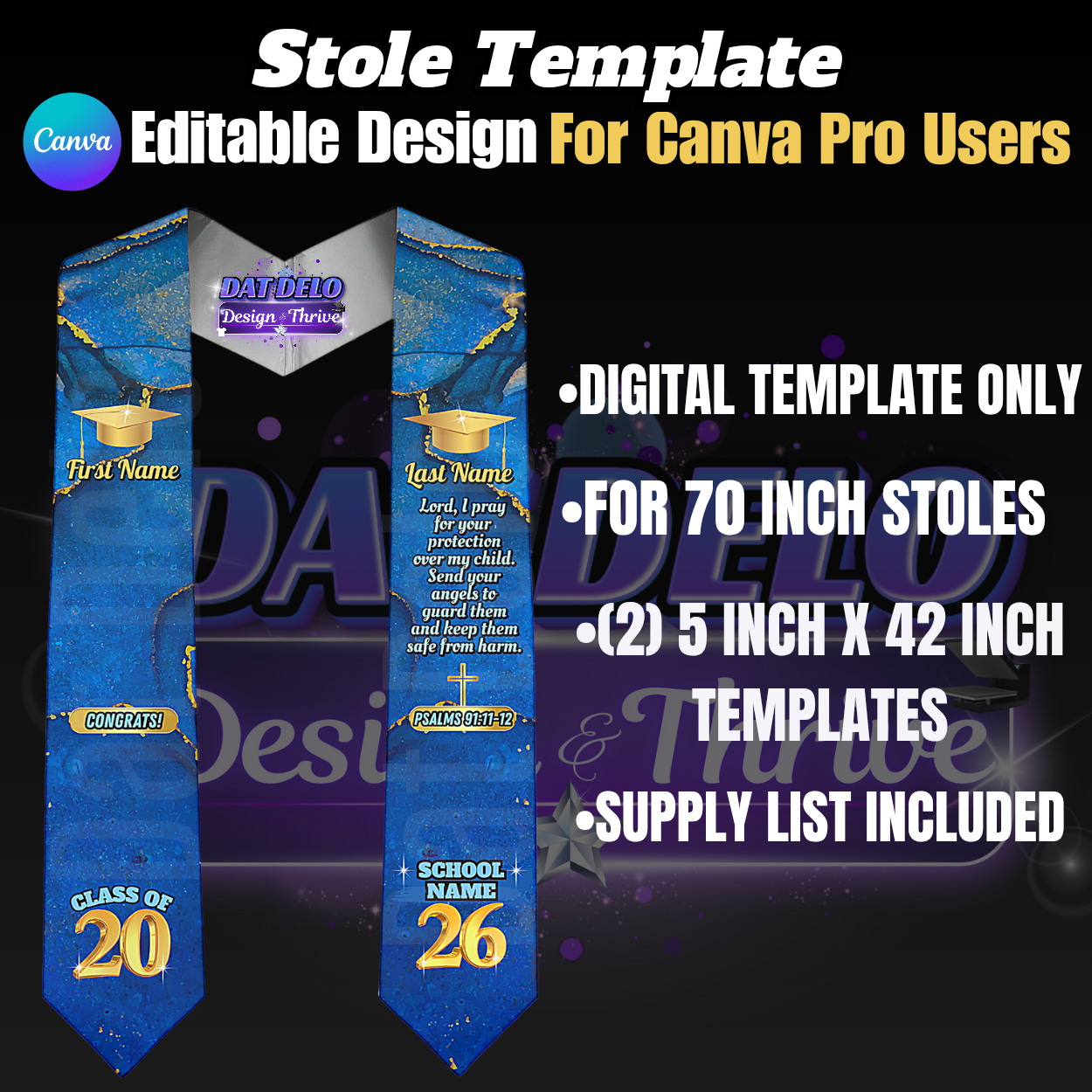 Editable Blue Marble Grad Stole Design & Supply List (CanvaPro)
