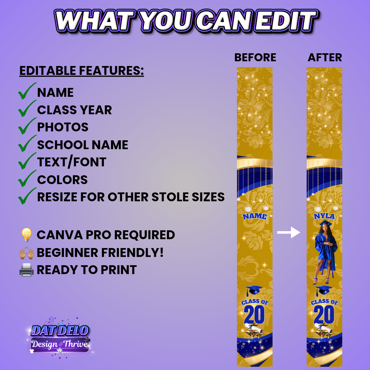 Gold & Blue Grad Stole Design Template, Supply List Included (Canva Pro Required)