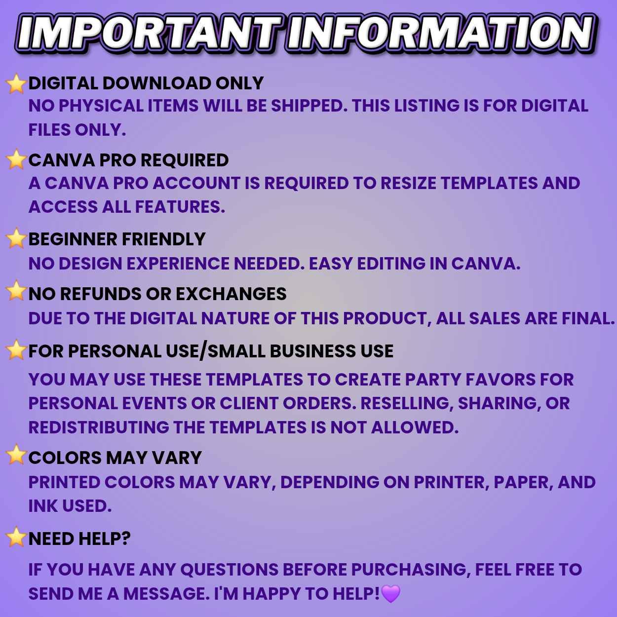 •This is a design template only, not pre-sized. You’ll need to measure your party favors and resize the design in Canva to match your items.