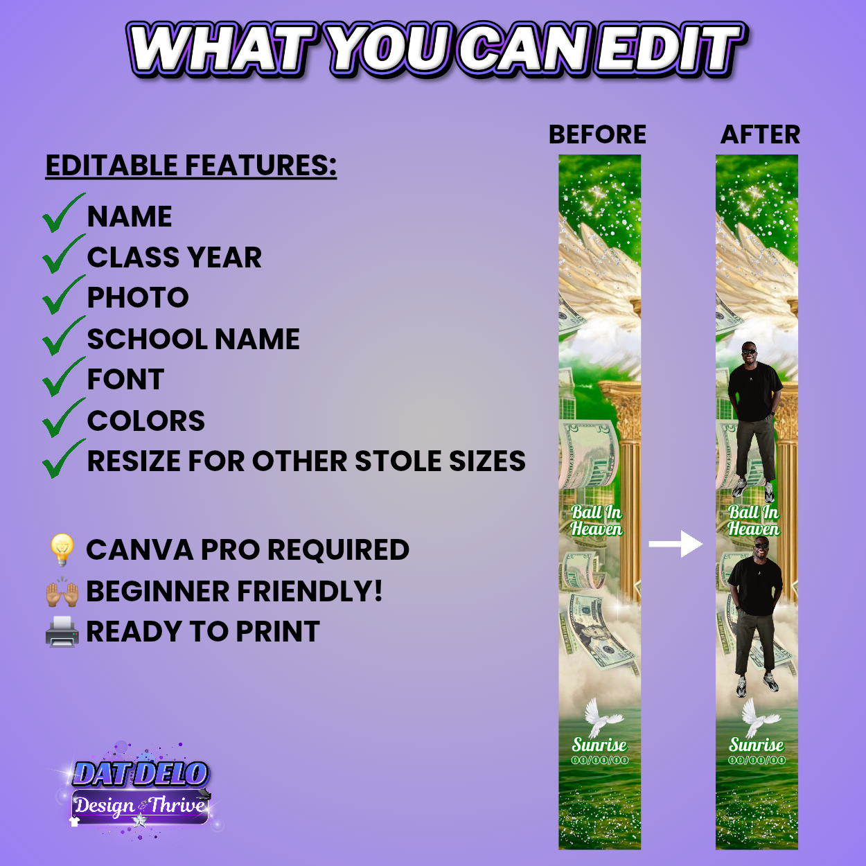This Green Memorial Stole Template features a money green “Ball In Heaven” theme designed for funeral services, remembrance ceremonies, and keepsake gifts. Editable instantly in Canva (Canva Pro required).