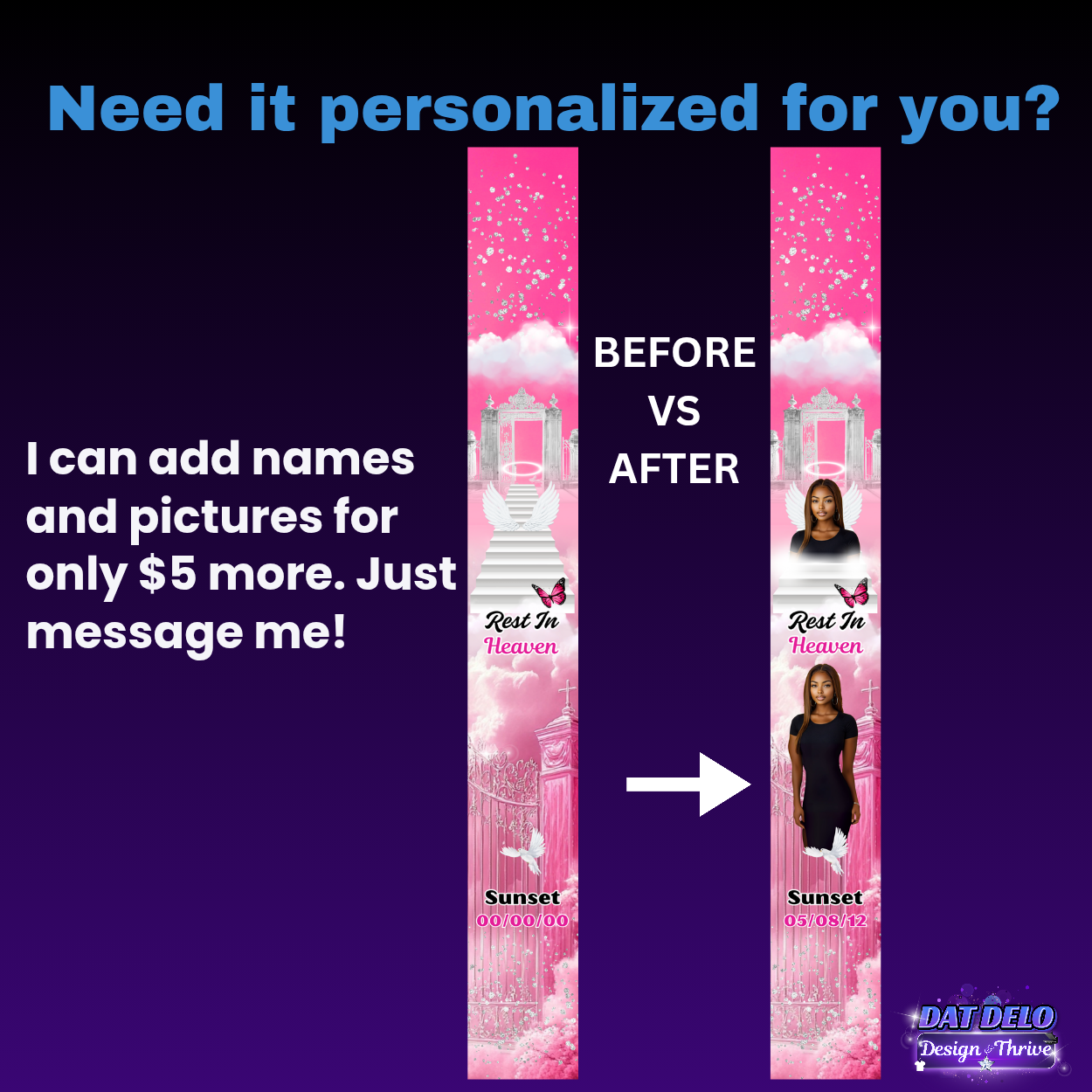 Create a beautiful memorial stole instantly with this editable Canva template. Featuring a soft pink & silver “Rest In Heaven” theme, it’s perfect for funeral keepsakes or remembrance events.