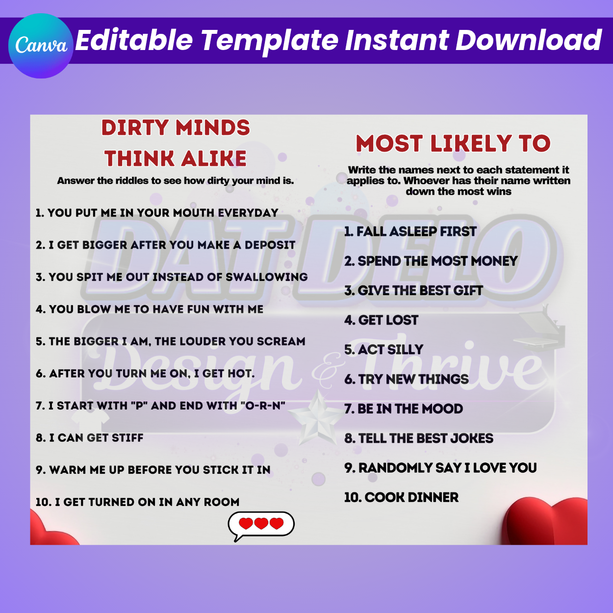 Get ready for V Day with our Valentine Game Book Template! Enjoy a fun interactive game book for couples and make this holiday extra special. Make this Valentine's Day extra special! This is a digital download only. Due to the nature of this product, there are no refunds available.